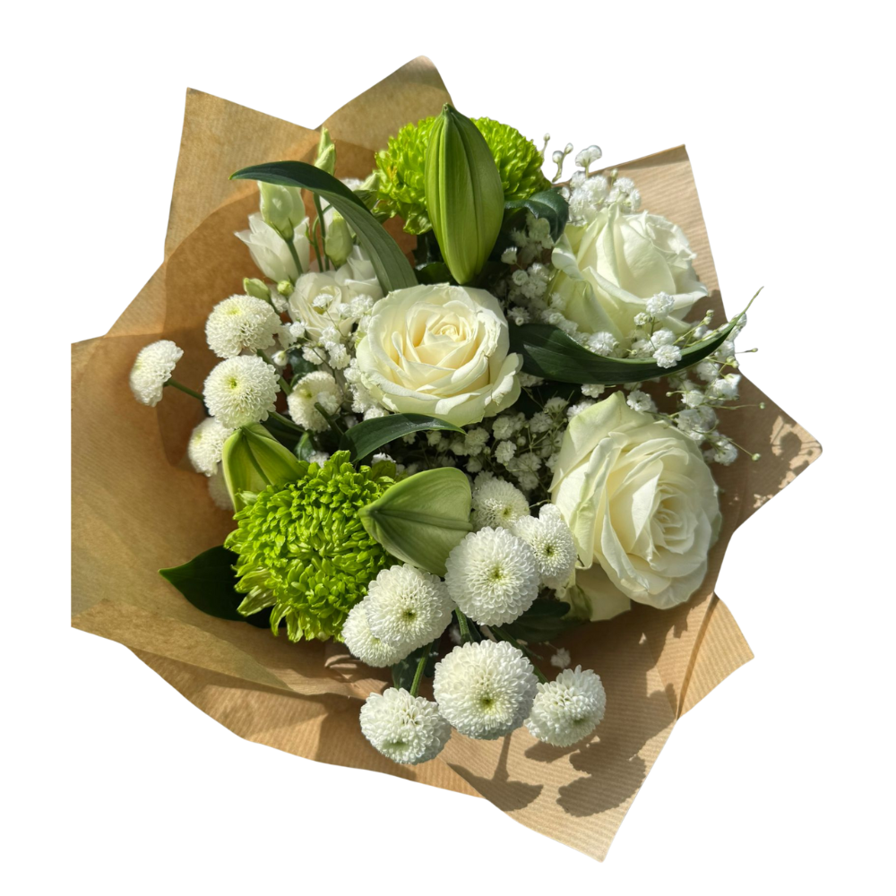 3 stems white Roses, 2 Stems green chrysanthemum,2 stems baby breath, 2 Stems white small garden mum , 1 stems Texas , 2 stems lily’s