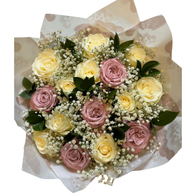 “Soft elegance in delicate blush tones.” A graceful blend of 10 white roses and 5 pink roses, accented with gypsophilia and fresh greenery. Presented in a gift bag with water and foam included