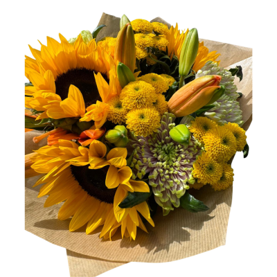 A vibrant and cheerful bouquet featuring sunflowers, lilies, chrysanthemums, and yellow garden mums. Perfect for brightening up any home, office, or special occasion.