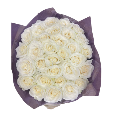 “Pure sophistication in every petal.” A luxurious arrangement of 30 pristine white roses in a gift bag, finished with floral foam and water for freshness. Elegant, pure, and timeless.