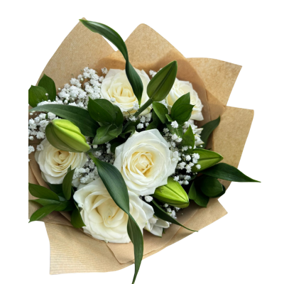 Timeless White Rose & Lily Handcrafted Bouquet (5 Roses, 2 Lilies)