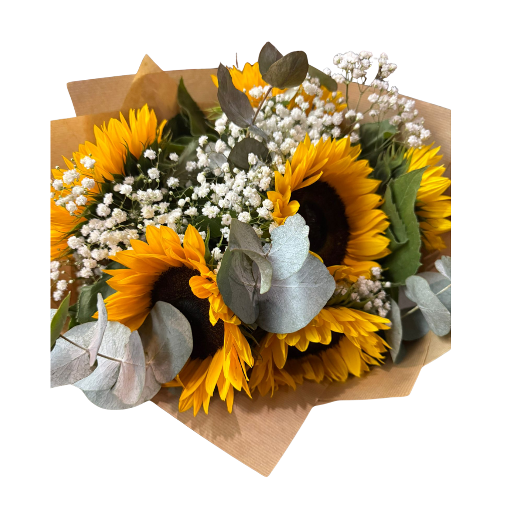 “Bright, bold, and beautifully uplifting.” A cheerful hand-tied bouquet of 6 radiant sunflowers, softened with gypsophilia and fragrant eucalyptus. A vibrant, uplifting gift for any occasion.