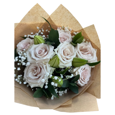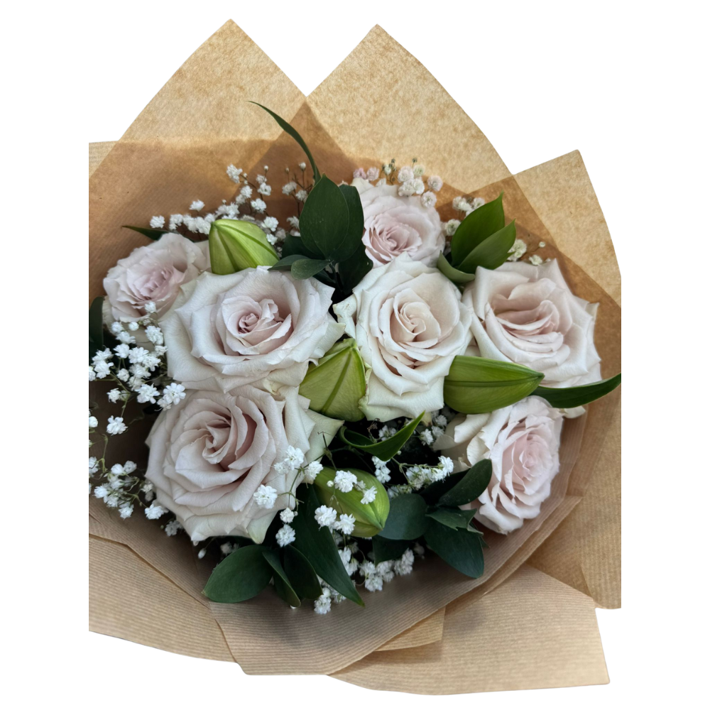 Pink Rose & Lily Handcrafted Bouquet (7 Roses, 2 Lilies)