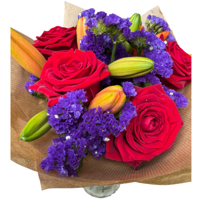 Shop a charming bouquet with 4 Red Roses, 2 Lilies, and 2 stems of Sea Lavender at Mahdi’s Plants and Flowers. Perfect for gifting, romantic gestures, or home decoration.