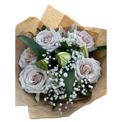 “A delicate bouquet full of sweetness.” A sweet bouquet of 5 pink roses and 2 large lily stems, finished with delicate gypsophilia and lush greenery. Perfect for birthdays, thank-you gifts, or romantic gestures.